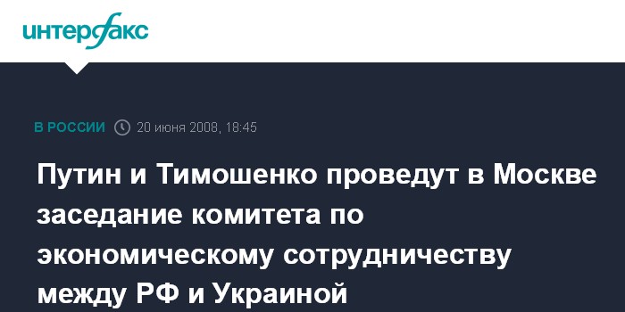 Москва. 20 июня. INTERFAX.RU - Главы правительств России и Украины Владимир Путин и Юлия Тимошенко договорились провести на следующей неделе в Москве заседание российско-украинского комитета по экономическому сотрудничеству.