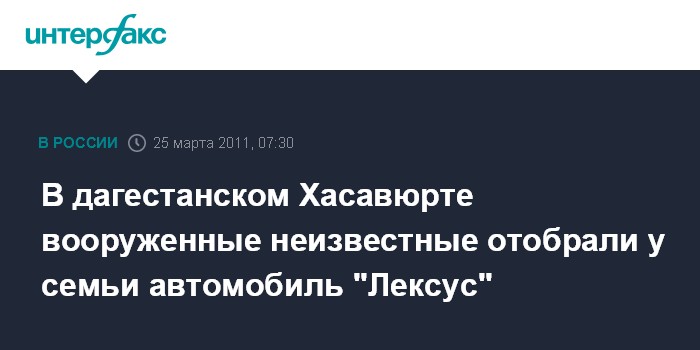 Ростов-на-Дону. 25 марта. ИНТЕРФАКС-ЮГ - Разбойное нападение совершено в дагестанском Хасавюрте на семью местных жителей, у которой неизвестные в масках под угрозой оружия отобрали автомобиль "Лексус".