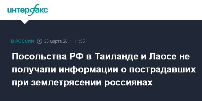 Бангкок. 25 марта. ИНТЕРФАКС - В посольстве России в Таиланде на данный момент нет информации о пострадавших в результате мощного землетрясения на Индокитайском полуострове соотечественниках.