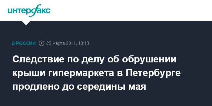 Санкт-Петербург. 25 марта. INTERFAX.RU - Главное следственное управление СКР по Петербургу продлило срок следствия по делу об обрушении крыши гипермаркета "О'Кей", сообщил "Интерфаксу" в пятницу официальный представитель ведомства Сергей Капитонов.