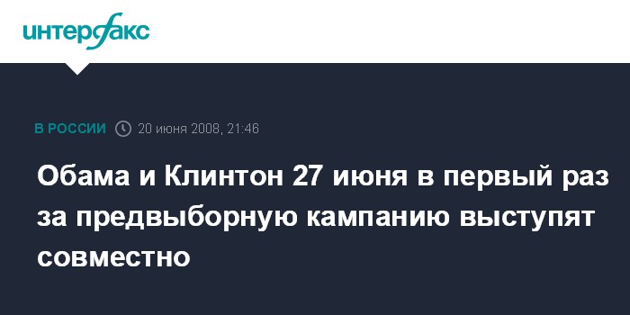 Вашингтон. 20 июня. ИНТЕРФАКС - Демократ Барак Обама, обеспечивший себе выдвижение в кандидаты в президенты США и его недавняя соперница Хиллари Клинтон решили провести 27 июня первое совместное выступление в рамках предвыборной кампании.