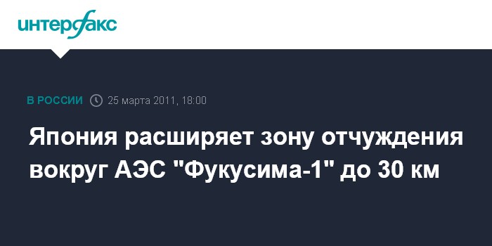 Токио. 25 марта. INTERFAX.RU - Зона отчуждения вокруг аварийной АЭС "Фукусима-1" по решению японского правительства расширена до 30 километров.