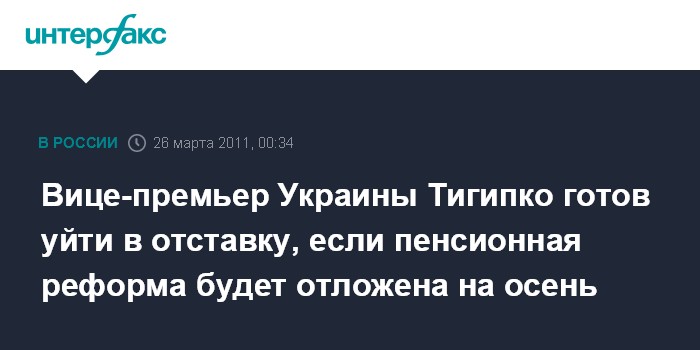 Киев. 26 марта. ИНТЕРФАКС-УКРАИНА - Вице-премьер - министр социальной политики Украины Сергей Тигипко обещает уйти в отставку, если до июля не будет принята подготовленная под его руководством пенсионная реформа.
