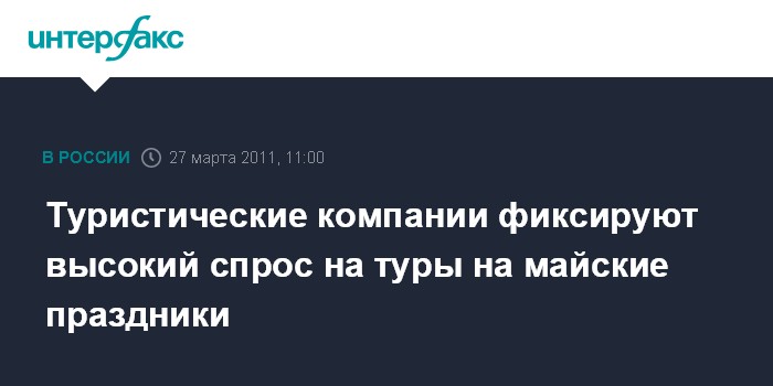 Москва. 27 марта. INTERFAX.RU - Представители туристических компаний фиксируют высокий спрос на туры на майские праздники, отмечая, что уровень спроса на подобные путевки в 2011 г. вырос по сравнению с прошлым годом. "Лидеры продаж на сегодняшний день - это европейские туры, основными чартерными направлениями являются Франция и Чехия. На втором месте, буквально "голова к голове", - это страны Скандинавии, Балтики и Финляндия. Третье место занимает любимая всеми Турция, летом она будет в лидерах по продажам, но на майские праздники занимает третье место", - сообщил "Интерфаксу" представитель крупной туристической компании.