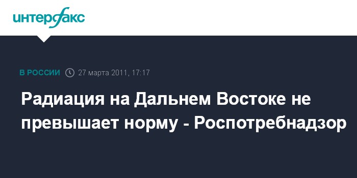 Москва. 27 марта. INTERFAX.RU - Уровень радиации в дальневосточном регионе РФ остается в пределах нормы, сообщает в воскресенье сайт Роспотребнадзора. "По данным мониторинга радиационной обстановки лабораториями Роспотребнадзора в Сахалинской, Магаданской областей, в Камчатском, Приморском и Хабаровском краях установлено, что уровни мощности дозы гамма-излучения не превышают многолетних сложившихся значений, характерных для территорий указанных субъектов", - отмечает Роспотребнадзор. Были проведены контроль атмосферного воздуха, исследования атмосферных выпадений, проб снега, воды подземных источников, питьевой воды.