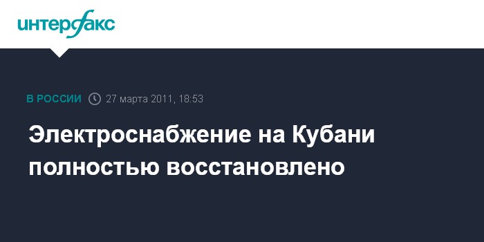 Краснодар. 27 марта. INTERFAX.RU - Энергетики восстановили электроснабжение во всех населенных пунктах Краснодарского края, нарушенное накануне из-за сильного ветра. "Сегодня к 18:00 мск электроснабжение на 100% восстановлено, все подключены", - сообщили агентству "Интерфакс-Юг" в пресс-службе администрации региона в воскресенье.