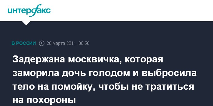 Как сообщила тогда официальный представитель Главного следственного управления СК РФ по Москве Виктория Цыпленкова, по заключению экспертов ребенок скончался от истощения. Причем последние двое суток девочку вообще не кормили.