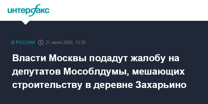 Москва. 21 июня. ИНТЕРФАКС-МОСКВА - Столичные власти намерены обратиться в прокуратуру Москвы с жалобой на действия депутатов Московской областной думы, которые препятствуют строительству малоэтажного жилья в деревне Захарьино.