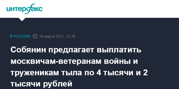 Собянин предлагает выплатить москвичам-ветеранам войны и труженикам тыла по 4 тысячи и 2 тысячи рублей