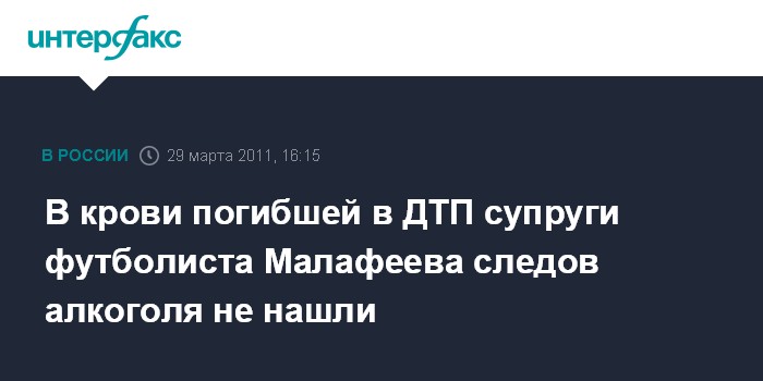 Санкт-Петербург 29 марта. INTERFAX.RU - Судебно-медицинская экспертиза не выявила алкоголя в крови супруги голкипера петербургского футбольного клуба "Зенит" и сборной России Вячеслава Малафеева Марины, погибшей в ДТП в северной столице, сообщил "Интерфаксу" источник в медицинских кругах во вторник.