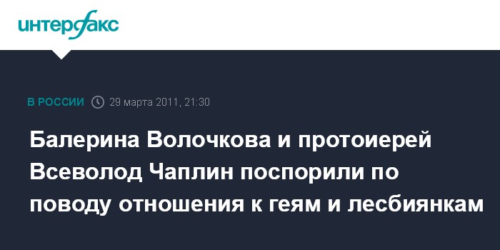 Москва. 29 марта. INTERFAX.RU - Полемика Анастасии Волочковой и представителей Русской православной церкви вышла на новый виток: балерина раскритиковала церковь за отношение к гомосексуалистам, а глава синодального Отдела по взаимоотношениям Церкви и общества протоиерей Всеволод Чаплин в ответ призвал пожалеть как геев, так и саму балерину.