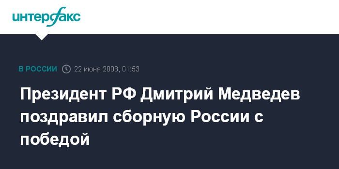 Москва. 22 июня. ИНТЕРФАКС - Президент РФ Дмитрий Медведев поздравил всех болельщиков, игроков и тренерский состав сборной России с великолепной игрой, проявлением выдержки, характера, убедительной победой над сборной Голландии в четвертьфинале чемпионата Европы по футболу.