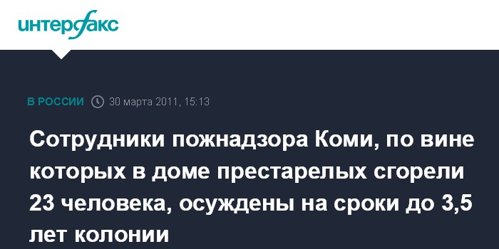 Сыктывкар. 30 марта. NTERFAX.RU - В Коми вынесен обвинительный приговор в отношении сотрудников Госпожнадзора, по чьей вине на пожаре в январе 2009 г. погибли 23 пенсионера, сообщила "Интерфаксу" старший помощник прокурора республики по взаимодействию со СМИ Наталия Спиридонова.