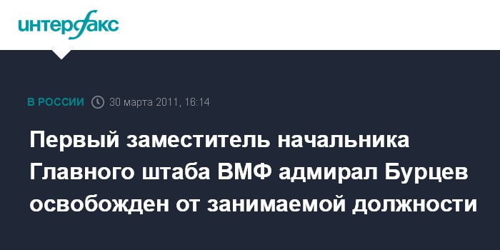 Москва. 30 марта. INTERFAX.RU - Президент России Дмитрий Медведев освободил от занимаемой должности первого заместителя начальника Главного штаба Военно-Морского Флота вице-адмирала Олега Бурцева, сообщает в среду сайт Кремля.