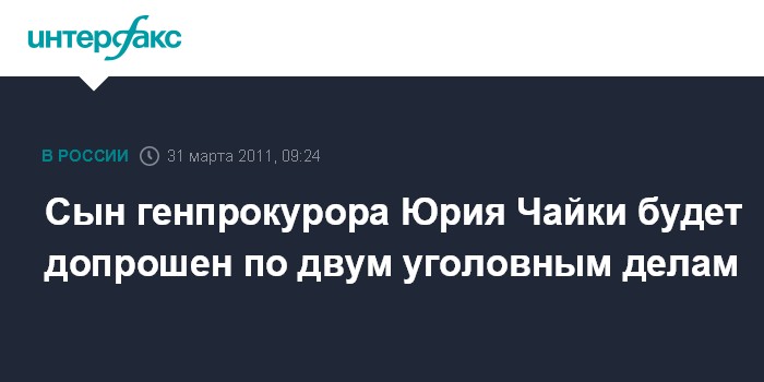 Москва. 31 марта. INTERFAX.RU - Главное следственное управление СКР по Московской области вызовет на допрос сына генпрокурора Юрия Чайки Артема. Допросить его собираются в рамках двух уголовных дел: о мошенничестве, связанном с незаконным игорным бизнесом, а также по делу о попытке вымогательства у главы Серпуховского района Александра Шестуна $2 млн.