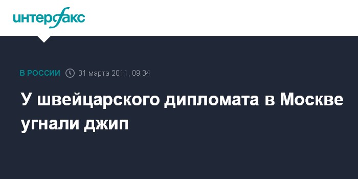 "Накануне днем в дежурную часть столичного ГУВД обратился 37-летний атташе посольства Швейцарии с заявлением об угоне. Дипломат заявил, что оставил свой автомобиль Jeep Wrangler с дипномерами около дома номер 11 на Ленинском проспекте во вторник вечером, а утром в среду машины на месте уже не было", - сказал собеседник агентства.