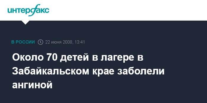 Чита. 22 июня. ИНТЕРФАКС-СИБИРЬ - Двадцать девять детей и один воспитатель госпитализированы в воскресенье с фолликулярной ангиной из одного из оздоровительных лагерей в Читинском районе Забайкальского края.