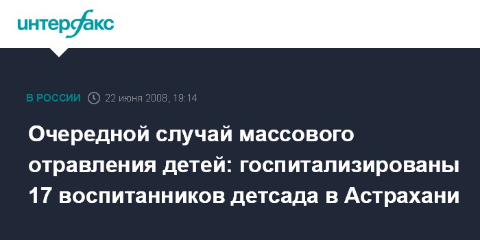 Астрахань/Ростов-на-Дону. 22 июня. ИНТЕРФАКС-ЮГ - В Астрахани 17 воспитанников детского сада № 110 госпитализированы с диагнозом "пищевое отравление", сообщили агентству "Интерфакс-Юг" в региональном ГУ МЧС РФ в воскресенье вечером.