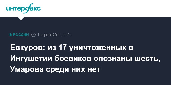 "Мы установили шестерых из 17 уничтоженных бандитов, Доку Умарова среди опознанных нет. Расследование не завершено", - сказал Евкуров.
