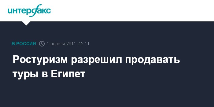 Москва. 1 апреля. INTERFAX.RU - Федеральное агентство по туризму РФ (Ростуризм) рекомендовал туроператорам и турагентствам с 1 апреля 2011 года возобновить оказание услуг по реализации турпродукта, включающего в себя путешествие российских туристов на курорты Египта.