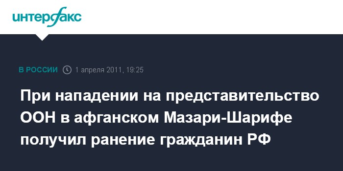 Москва. 1 апреля. INTERFAX.RU - Россиянин, возглавляющий представительство ООН в афганском городе Мазари-Шарифе, был ранен в результате нападения на офис организации в этом городе, заявил пресс-атташе посольства России в Кабуле Степан Аникеев.