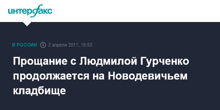 Москва. 2 апреля. INTERFAX.RU - Гроб с телом народной артистки СССР Людмилы Гурченко под звуки гимна России и залпы ружейного салюта опустили в могилу на Новодевичьем кладбище.