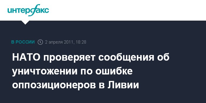Брюссель. 2 апреля. INTERFAX.RU - Командование североатлантического альянса начало расследование в связи с сообщениями СМИ об убийстве по неосторожности 17 ливийских оппозиционеров, совершенном натовскими ВВС, сообщает в субботу агентство ЭФЭ. "Мы проверяем эти сведения. Нас всегда тревожит информация о гибели мирных жителей. Миссия НАТО состоит в том, чтобы защищать гражданских и их населенные пункты от нападения", - заявила официальный представитель альянса Оана Лунгеску.