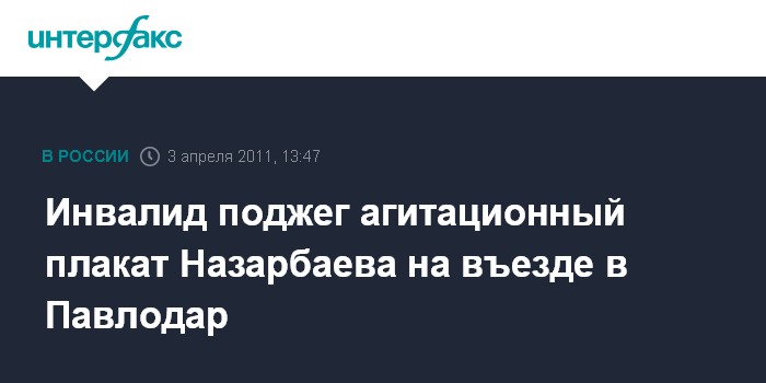 Астана. 3 апреля. INTERFAX.RU - В казахстанском Павлодаре в день выборов президента страны был подожжен агитационный билборд одного из кандидатов - действующего главы государства Нурсултана Назарбаева. "Сегодня утром было зафиксировано одно нарушение: на въезде в город Павлодар был подожжен билборд кандидата в президенты Назарбаева", - сообщил директор департамента по надзору за законностью в социально-экономической сфере генеральной прокуратуры Казахстана Андрей Кравченко журналистам в воскресенье в Астане.