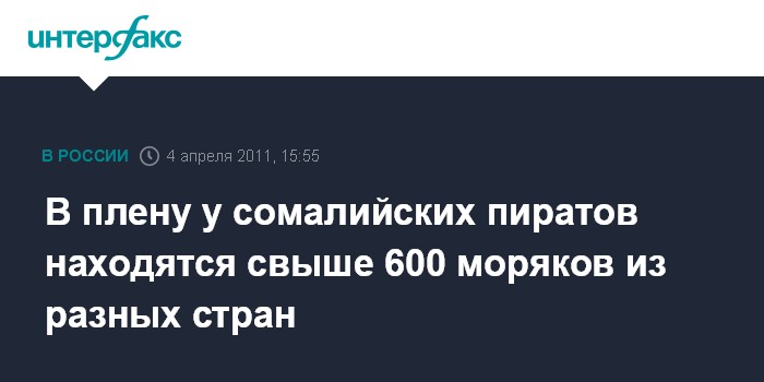 Санкт-Петербург. 4 апреля. INTERFAX.RU - Сомалийские пираты держат в заложниках свыше 600 моряков со всего мира, сообщил сайт Российского профсоюза моряков.