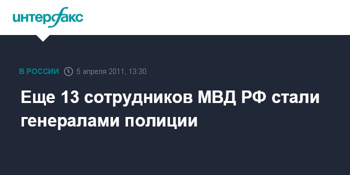 Москва. 5 апреля. INTERFAX.RU - Президент России Дмитрий Медведев присвоил звания генералов полиции 13 сотрудникам МВД, относящимся к высшему начальствующему составу, сообщила во вторник пресс-служба главы государства.