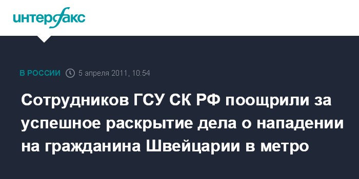 Москва. 5 апреля. INTERFAX.RU - Руководство Следственного комитета РФ поощрило сотрудников московского Главного следственного управления (ГСУ) ведомства за успешное раскрытие нападения на гражданина Швейцарии, забитого до смерти участниками акции "Русский марш" в 2009 году на станции метро "Римская".