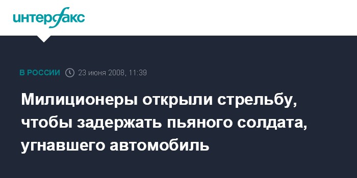 Москва. 23 июня. INTERFAX.RU - В Петербурге сотрудникам патрульно-постовой службы пришлось применять табельное оружие, чтобы остановить пьяного солдата на угнанном автомобиле.