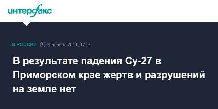 Москва. 6 апреля. INTERFAX.RU - Истребитель Су-27, разбившийся в среду в Приморском крае, упал вне населенного пункта, жертв и разрушений на земле нет, сообщает сайт Следственного комитета РФ.