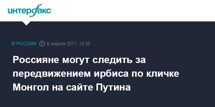 Москва. 6 апреля. INTERFAX.RU - Вся Россия теперь может наблюдать за передвижением снежного барса - ирбиса по кличке Монгол на сайте премьер-министра РФ Владимира Путина.