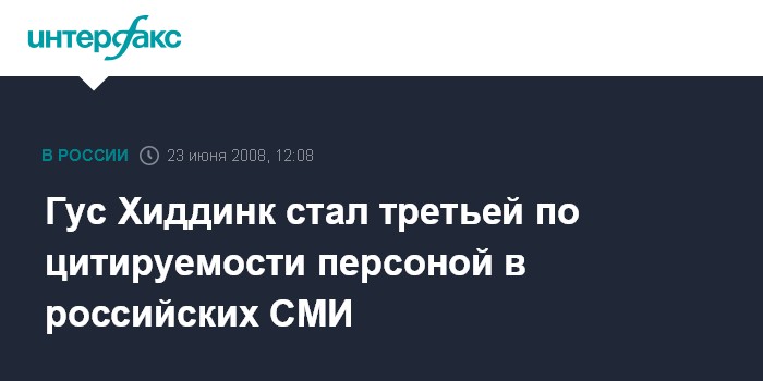 Москва. 23 июня. INTERFAX.RU - Главный тренер сборной России по футболу Гус Хиддинк занял третье место в недельном рейтинге упоминаемости в СМИ российских и иностранных персон, показывают данные "Системы комплексного анализа новостей" - СКАH, созданной "Интерфаксом".