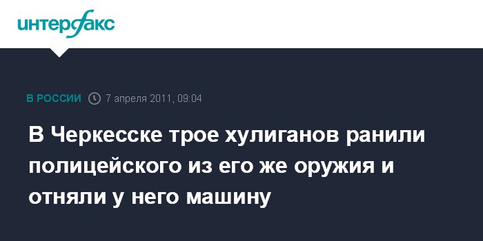 Москва. 7 апреля. INTERFAX.RU - Трое злоумышленников в Черкесске напали на участкового, избили, отняли оружие, а затем скрылись на его же машине, сообщил "Интерфаксу" в четверг источник в правоохранительных органах.
