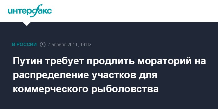 Москва. 7 апреля. INTERFAX.RU - Премьер-министр РФ Владимир Путин потребовал от руководителя Росрыболовства Андрея Крайнего продлить мораторий на распределение участков для коммерческого рыболовства до принятия нового закона о рыболовстве.