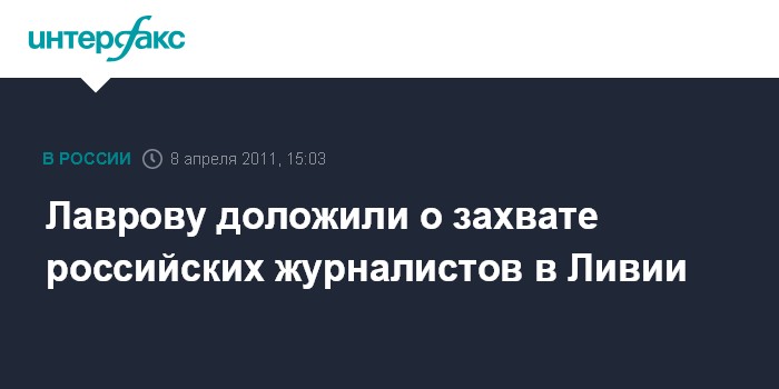 Киев. 8 апреля. INTERFAX.RU - Глава МИД РФ Сергей Лавров оповещен о захвате российских журналистов в Ливии, министр дал указание проверить эту информацию и предпринять необходимые шаги для решения ситуации, заявил "Интерфаксу" российский дипломатический источник.