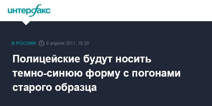 Москва. 8 апреля. INTERFAX.RU - Российские полицейские будут носить форму темно-синего цвета, следователи - серо-голубого цвета, а погоны сохранят свой прежний вид. Такие нормы содержатся в постановлении правительства РФ, проект которого размещен в пятницу на сайте МВД РФ.