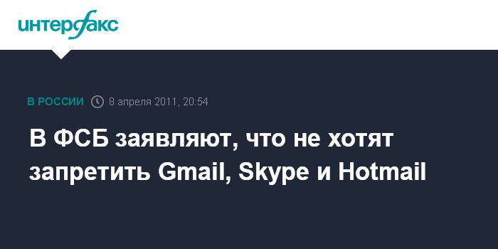 Москва. 8 апреля. INTERFAX.RU - ФСБ России не предлагала запретить гражданам пользоваться сервисами Gmail, Skype и Hotmail, утверждают в спецслужбе.