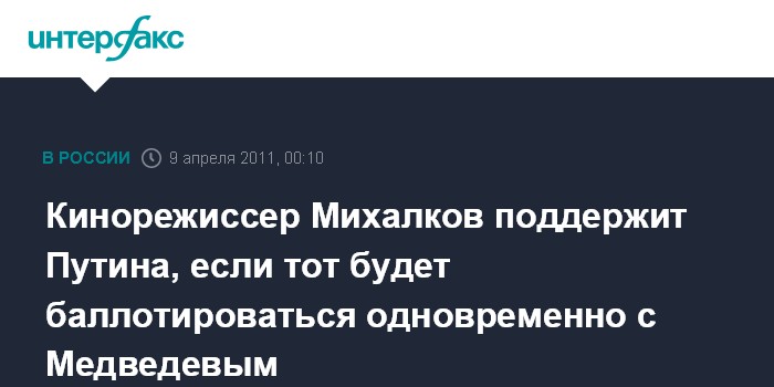 Москва. 8 апреля. ИНТЕРФАКС - Кинорежиссер Никита Михалков заявил, что если на президентских выборах 2012 года будут одновременно баллотироваться Дмитрий Медведев и Владимир Путин, он поддержит действующего премьер-министра.