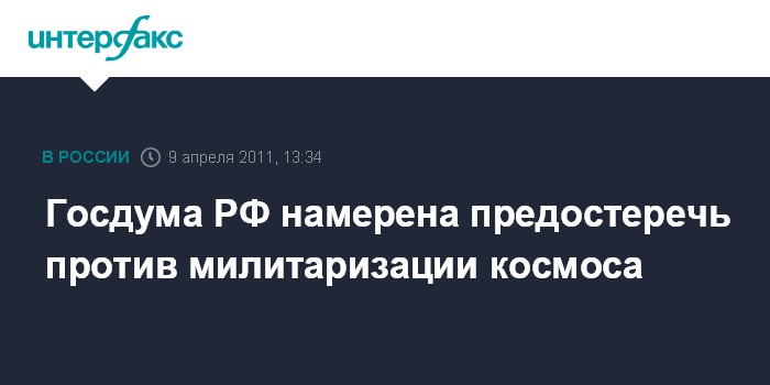 Москва. 9 апреля. INTERFAX.RU - Госдума планирует выступить с заявлением "В связи с 50-летием первого полета человека в космос", в котором подтверждается стремление России оградить космос от оружия массового уничтожения. Документ включен в повестку дополнительного пленарного заседания, которое состоится 11 апреля, накануне Дня космонавтики, сообщили "Интерфаксу" в субботу в аппарате нижней палаты парламента. "Россия последовательно борется за предотвращение вывода в космос наступательных вооружений, за предотвращение гонки вооружений в космическом пространстве", - говорится в проекте заявления.