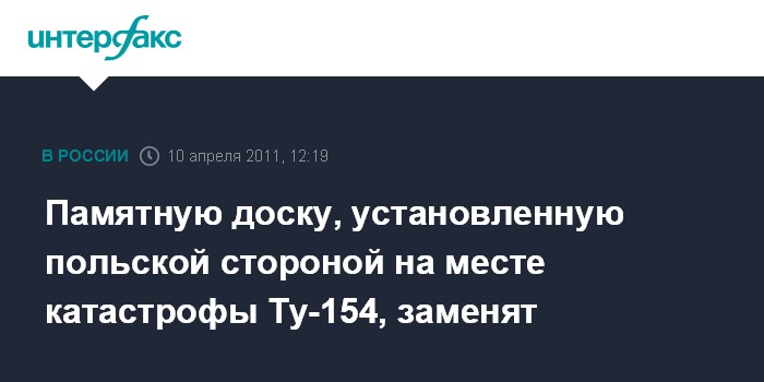 Смоленск. 10 апреля. INTERFAX.RU - Власти Смоленской области приняли решение заменить памятную доску, установленную польской стороной на месте катастрофы самолета Ту-154 президента Польши Леха Качиньского, поскольку надпись на ней не была согласована с областной администраций и органами городского самоуправления. Такое заявление сделал в воскресенье пресс-секретарь губернатора Смоленской области Андрей Евсеенков.