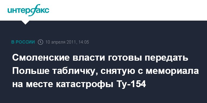 Ранее А.Евсеенков заявил "Интерфаксу", что власти Смоленской области приняли решение заменить памятную доску, установленную польской стороной на месте катастрофы самолета Ту-154 президента Польши Леха Качиньского, поскольку надпись на ней не была согласована с областной администраций и органами городского самоуправления.