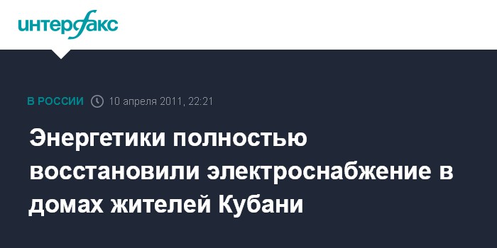 Краснодар. 10 апреля. ИНТЕРФАКС-ЮГ - Энергетики полностью восстановили электроснабжение потребителей в нескольких районах Краснодарского края, нарушенное из-за шквалистого ветра, сообщает пресс-служба ОАО "Кубаньэнерго" в воскресенье.