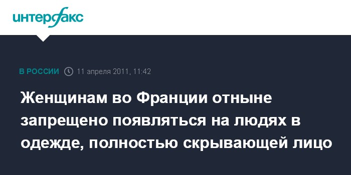 Париж. 11 апреля. INTERFAX.RU - Закон о запрете на ношение женщинами одежды, полностью закрывающей лицо, вступил в понедельник в силу во Франции.