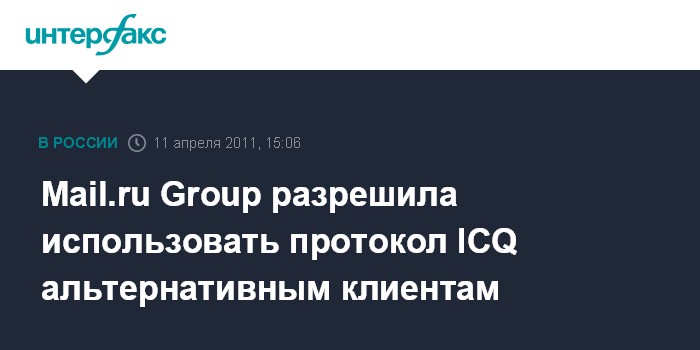 Москва. 11 апреля. INTERFAX.RU - Mail.ru Group, в прошлому году купившая ICQ, разрешила официально использовать протокол интернет-мессенджера альтернативным клиентам.
