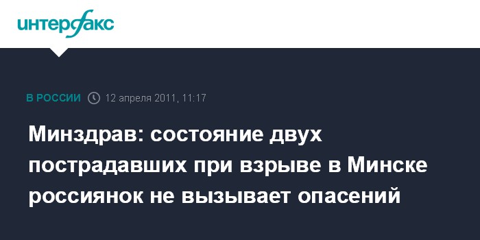 Минск. 12 апреля. INTERFAX.RU - В одной из минских больниц находятся две пострадавшие при взрыве в минском метро гражданки России, их состояние средней степени тяжести, сообщил журналистам во вторник в Минске министр здравоохранения Белоруссии Василий Жарко.