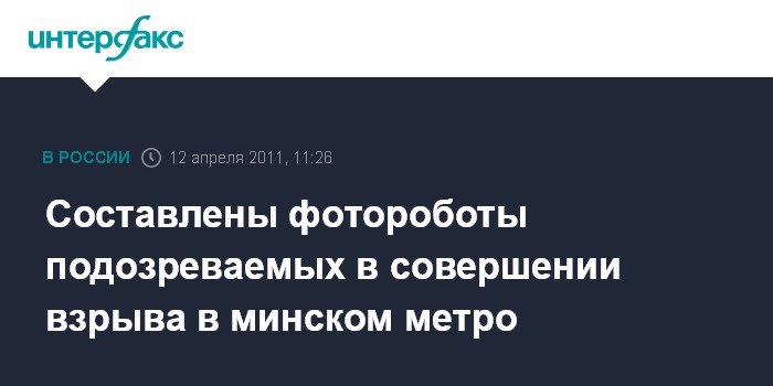 Минск. 12 апреля. INTERFAX.RU - МВД Белоруссии составило фотороботы двух человек, подозреваемых в совершении теракта в метро, заявил на брифинге в Минске глава МВД Анатолий Кулешов.