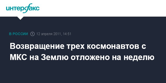 Москва. 12 апреля. INTERFAX.RU - Экипаж пилотируемого корабля "Союз ТМА-20", находящийся на Международной космической станции (МКС) с декабря 2010 г., вернется на Землю на неделю позже, сообщил "Интерфаксу-АВН" во вторник источник в ракетно-космической отрасли.